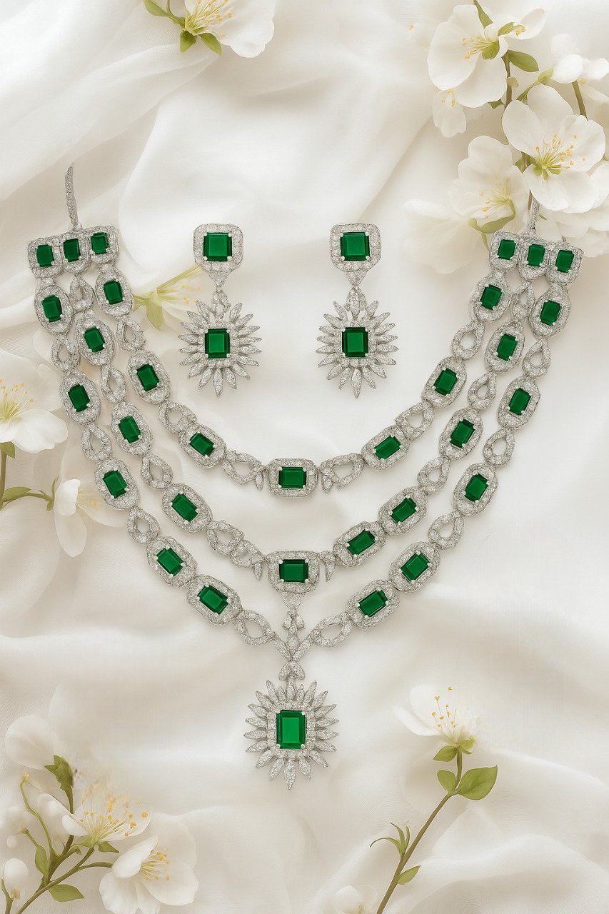 This Emerald Green Multi-Layer Necklace Set is handcrafted with premium American Diamonds and bold emerald stones, ensuring that every woman feels like royalty on her special day 👑.