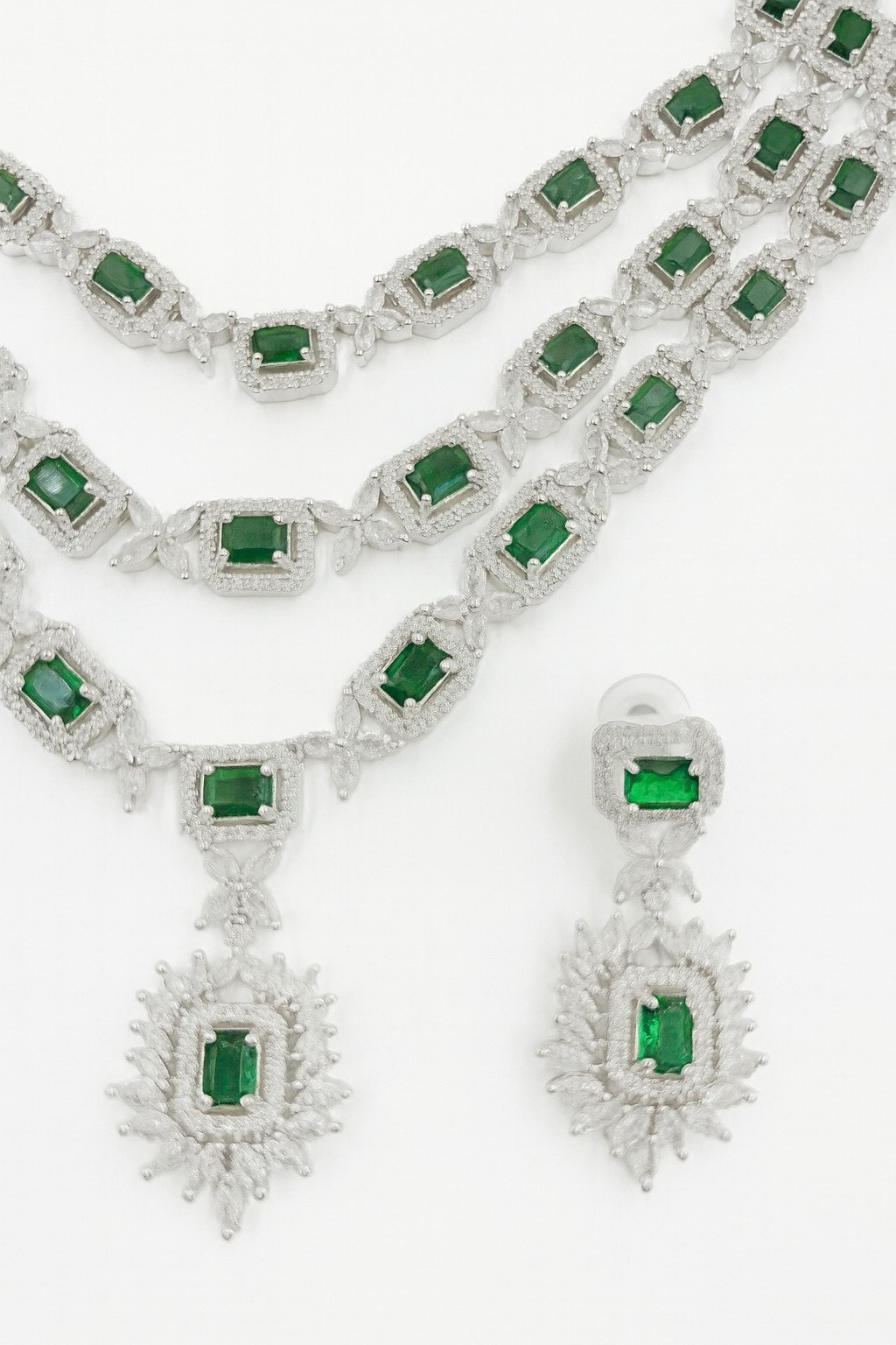 The necklace features three cascading layers of emerald-cut green stones, each framed with sparkling American Diamonds 💚💎.