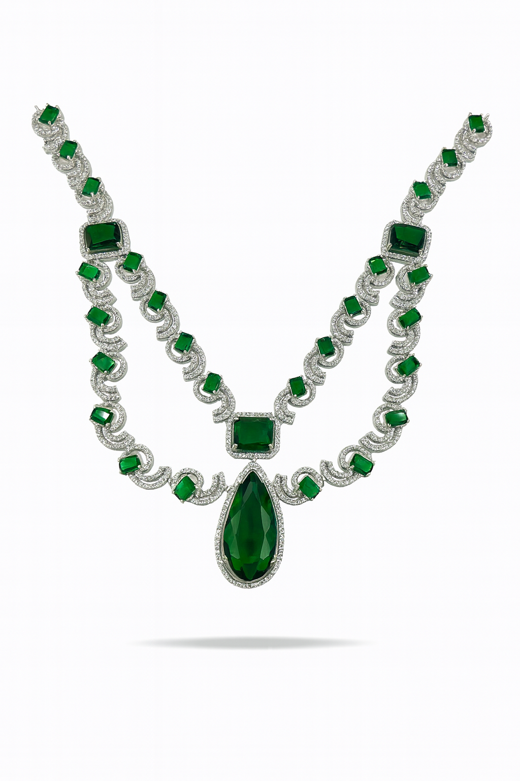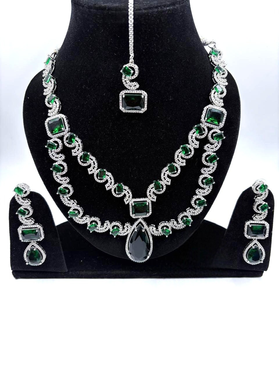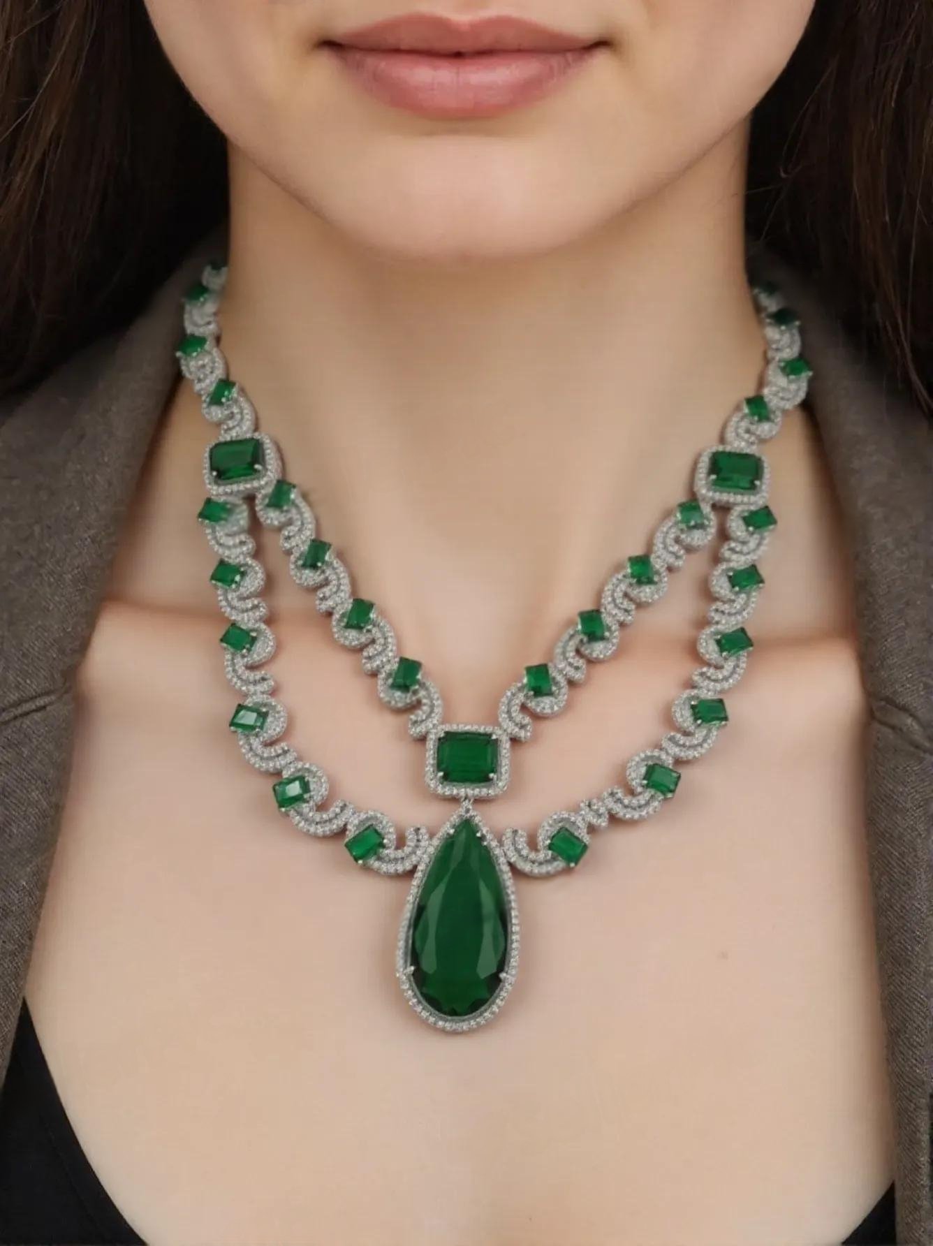 💚 ROYAL EMERALD GREEN LOOK – Designed with emerald green crystals and sparkling American Diamonds, this set offers the same charm as real emeralds 🌿. Moreover, the double-strand necklace and matching earrings create a bold yet graceful style.